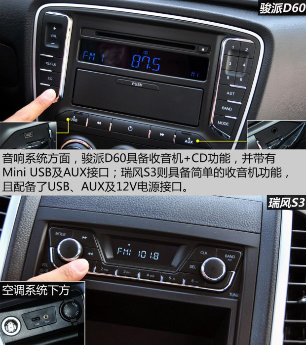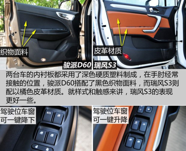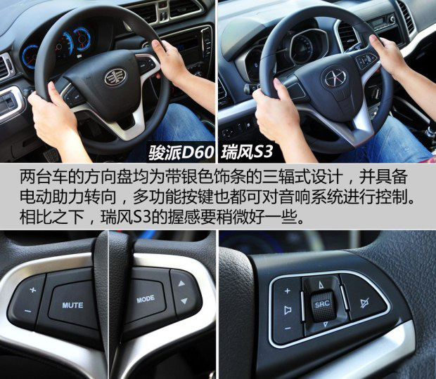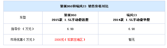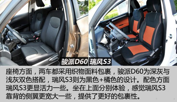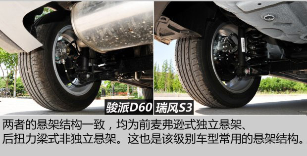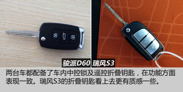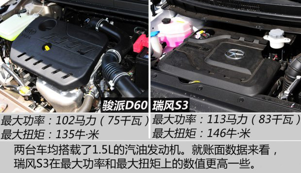 駿派D60和瑞風(fēng)S3分別與2014年10月和8月上市。由于瑞風(fēng)S3的最低配車型 1.5L 手動舒適型尚無現(xiàn)車。我們則選擇了兩者的次低配車型:駿派D60 1.5L手動舒適型和瑞風(fēng)S3 1.5L手動豪華型進(jìn)行對比(以下分別簡稱駿派D60和瑞風(fēng)S3),兩者的指導(dǎo)價格分別為6.99萬元和6.98萬元。