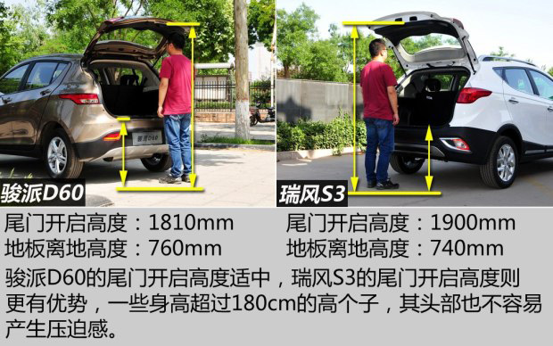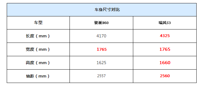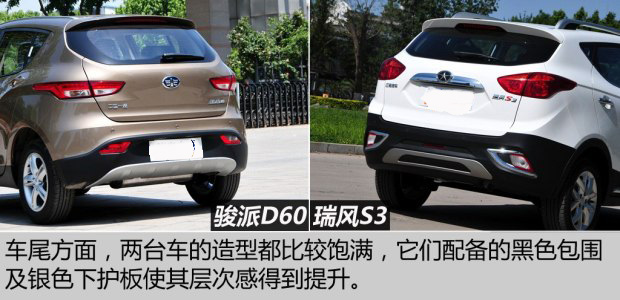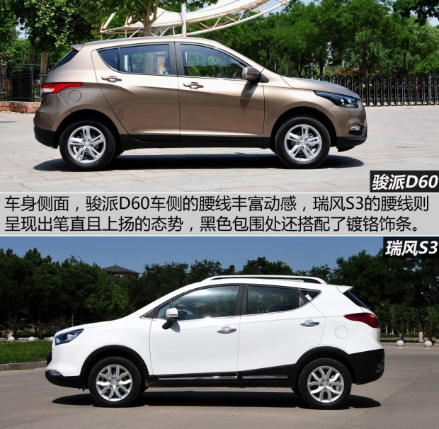 兩臺車的外形設(shè)計都比較簡約,均彰顯出小巧而年輕化的小型SUV特點,比較迎合年輕人的審美風(fēng)格。在車身尺寸上,駿派D60的長/寬/高分別為4170×1765×1625mm,軸距為2557mm;瑞風(fēng)S3的長/寬/高則分別是4325×1765×1660mm,軸距達(dá)到2560mm。,瑞風(fēng)S3在長度和高度方面的優(yōu)勢較為明顯。