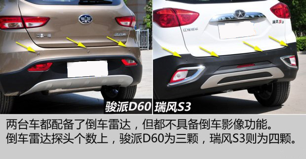 車尾方面,兩臺車的造型飽滿且層次感較強(qiáng),另外它們均配備了擾流板、高位剎車燈、后雨刷器及倒車?yán)走_(dá)。駿派D60融入了LED光源的后尾燈更帶感,瑞風(fēng)S3的四顆倒車?yán)走_(dá)探頭則更實在。