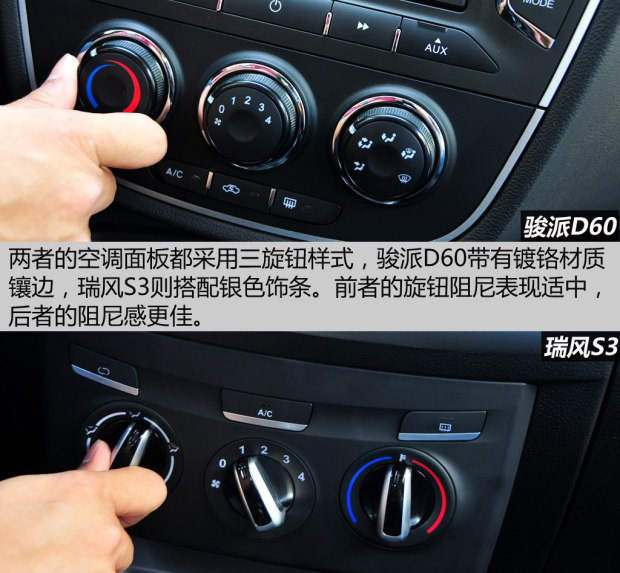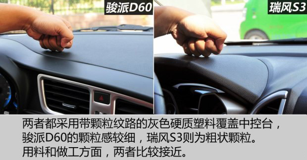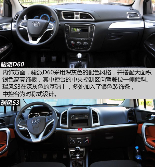 兩臺車都采用了大面積的深灰色進(jìn)行搭配,略有不同的是駿派D60加入銀色高亮飾板,瑞風(fēng)S3則采用銀色裝飾條。兩者的用料和做工差別不大。前者的中控臺采用了向駕駛位傾斜的設(shè)計,更注重駕駛者的使用感受;后者則為對稱式布局。