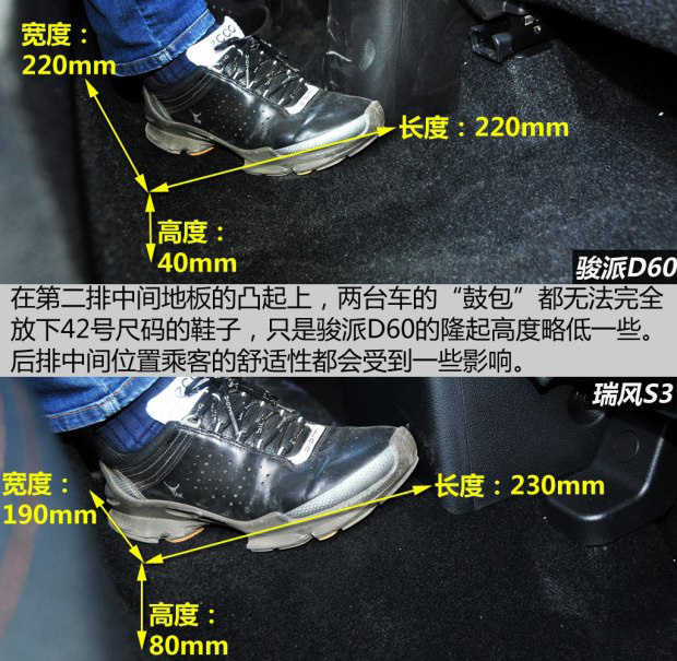 在乘坐空間方面,瑞風(fēng)S3在第一排頭部空間上存在優(yōu)勢,駿派D60則在第二排頭部空間上扳回一些。兩者則在第二排腿部空間上保持一致,同為兩拳余量。而在兩臺車的第二排地板中間隆起上,42號尺碼的鞋子都無法完全放在上面,中間乘客的舒適性不太理想。