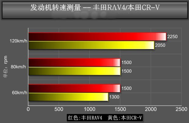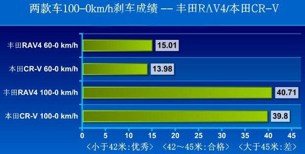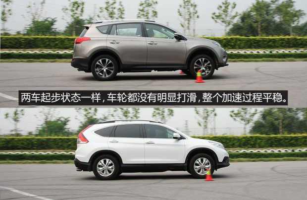 兩款車的動力都屬于正常水平,起步時車輪都沒有明顯打滑,整個加速過程也相對平穩。不過由于RAV4更靈敏的油門響應使得它在起步階段就領先了本田CR-V,并且一直保持到100km/h。最終RAV4的成績為10.02秒,CR-V的成績為10.68秒,這兩個成績在同級別中都屬于比較好的。