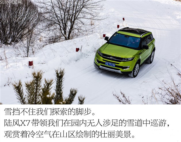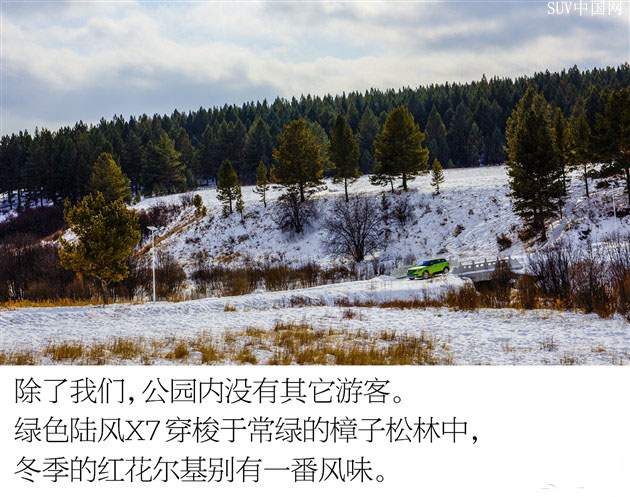 空無一人的園區雪厚天冷,松軟雪地也無車轍印可以幫忙。陸風X7的雪地模式能夠有效防止低速時發動機輸出功率過大,導致車輪空轉陷車或在冰面上打滑;陡坡緩降功能在雪地下坡時幫了我們不少忙,駕駛員不用費勁控制剎車,穩住方向即可。自動空調與座椅加熱更不用說,從零下20度的室外跑進車里感覺好似復生了一般。園區內部沒有補給與休息地方,陸風X7給了我們一個舒適的移動休息站。