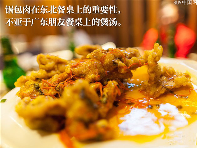 酸甜口的鍋包肉在以咸為主的東北菜系中有點異類。起源據說是一位住在哈爾濱的北京滿人為了照顧毛子客人的口味而發明。鍋包肉很考驗大廚手法,肉片厚度要均勻,裹好粉兩遍下鍋炸至金黃,出鍋后明油怎么淋、酸甜汁怎么調,稍搞不好鍋包肉就成了沒菠蘿的咕佬肉。一盤好鍋包肉甚至可以獨立成席,在東北一日不吃鍋包肉,每天都會覺得少了點啥。