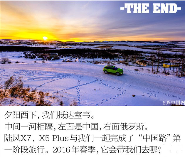 酒足飯飽再往北行,我們抵達了本次旅程的終點——室韋。室韋與俄羅斯小鎮奧洛契僅一河之隔,沿著祖國東北向遠東大陸延伸的中國路至此告一段落。兩輛陸風X7與一輛X5 Plus與我們一起抵抗嚴寒與惡劣路況,成功完成了第一階段陸風“中國路”東北邊境探索之旅。2016年春天,陸風會帶我們探訪祖國的何種美景?
