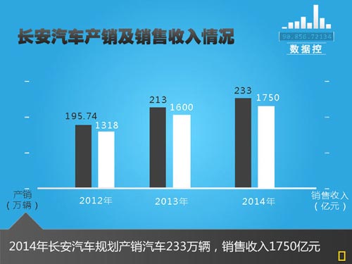 長安汽車在2012年累計銷售195.74萬輛,實現銷售收入1318 億元。2013年共銷售213萬輛,銷售收入同比增長21.4%。其中依靠睿騁、致尚XT等多款新車型的推出,長安品牌銷售38萬輛,增速保持自主品牌轎車第一位。長安汽車股份公司總裁張寶林先生表示:2014年長安汽車規劃產銷汽車233萬輛以上,銷售收入將達到1750億元。并將通過在自主品牌進一步加大新車研發力度,長安乘用車今年有望銷售60萬輛以上。