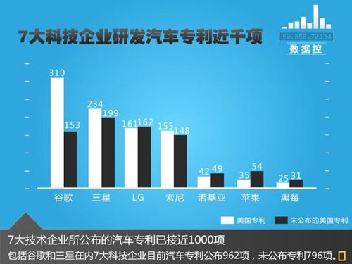 目前包括谷歌、三星、LG、索尼、諾基亞、蘋果以及黑莓在內的7家廠商,已在美國申請并公布了962項設計汽車領域的專利技術,其中大部分涉及車載導航應用、新能源汽車和電動車型驅動等方面。而在上市科技企業中谷歌共擁有310項已公布的專利項目和153項尚未公布的專利技術,其也成為了在汽車領域研發專利最多的IT企業。