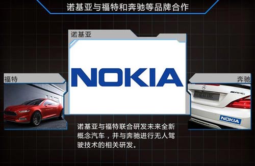 在國內有著“最耐摔”手機之稱的諾基亞品牌,同樣也涉足到汽車行業中,利用電子科技實現更深層次的個性化服務。諾基亞地理位置及商務產業部作為福特汽車的集成商之一,正共同努力將這種智能技術推向市場,通過電腦和感應技術讓駕駛成為一種享受。此外,諾基亞和奔馳也聯合一個團隊,利用諾基亞特有技術的優勢,為智能汽車建立一個3D智能地圖,競爭汽車無人駕駛技術這一新興領域。