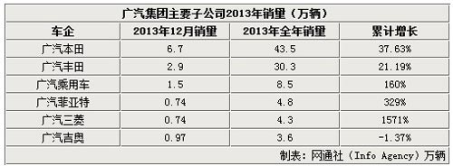 “百萬輛俱樂部”成員再添一員。近日,廣汽集團(tuán)發(fā)布2013年全年銷量,2013年12月,廣汽集團(tuán)銷售14.1萬輛,全年累計(jì)銷售100.4萬輛,同比增長達(dá)41%,成為繼上汽、東風(fēng)、一汽、長安、北汽之后,中國第六家產(chǎn)銷規(guī)模過百萬的汽車集團(tuán)。在2014年,廣汽集團(tuán)投放的新車將達(dá)到10款,產(chǎn)銷至少維持兩位數(shù)以上的較大增幅。
