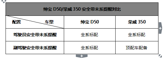 很多安全配置,在啟程出發(fā)前就要格外關(guān)注,例如,安全帶未系提醒、兒童座椅接口等。不少人乘車沒(méi)有系安全帶的習(xí)慣,尤其是副駕駛位置的人,直到聽(tīng)見(jiàn)“嘀嘀嘀”的提示聲才意識(shí)到。很顯然,這種情況下,如果車輛不帶提醒功能,會(huì)間接影響乘員的旅途安全。對(duì)比來(lái)看,兩車均擁有駕駛員安全帶未系報(bào)警功能;不同的是,榮威350沒(méi)對(duì)副駕駛“一視同仁”,僅頂配版有副駕駛安全帶未系報(bào)警,紳寶D50是全系標(biāo)配。
