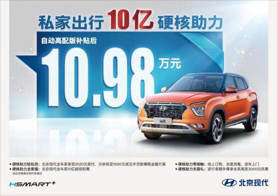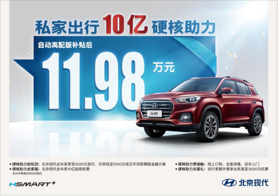 在此鉅惠活動中,北京現代不僅提供全車系享受2020元首付,月供低至1000元或五年貸款期限金融方案,還對針對旗下熱銷車型提供了“升級版”優惠方式,新一代ix25、第四代途勝、新一代ix35三款熱門SUV車型更享購置稅、全險、三年利息全免的優惠政策。