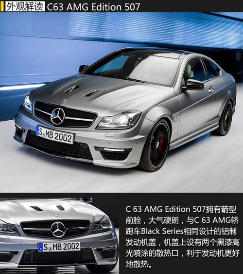 C 63 AMG Edition 507擁有箭型前臉,大氣硬朗,與C 63 AMG轎跑車Black Series相同設計的鋁制發動機蓋,機蓋上設有兩個黑漆高光噴涂的散熱口,利于發動機更好地散熱。高光黑色玻璃鏡罩更呈現了完美的側面效果。另一個獨特 之處是新型的AMG輕合金交叉輻條輪轂設計,其前輪胎尺寸為235/35 R19,后輪胎尺寸為255/30 R19。AMG輕合金輪轂提供兩種款式可選:啞光灰色高光涂層和啞光黑色高光澤輪圈輻條,配以紅色剎車卡鉗,同樣是外觀設計的一大亮點。