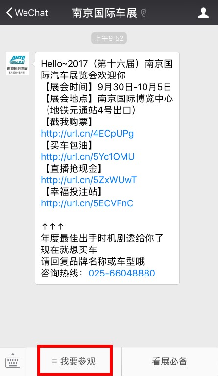 觀眾購票,電腦端購票可登陸http://url.cn/4E5Nlw7;手機端購票關注車展官方微信公眾號“南京國際車展”或“nj-auto”,底部菜單欄點擊【我要參加】-【我要購票】,即可在線購票;在線購票后,車展官方微信底部菜單欄點擊【我要參觀】-【我的票證】,獲取二維碼電子門票,車展現場掃碼即可入場。