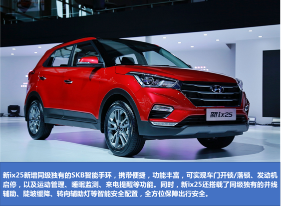 新ix25的最大亮點,一是新增了同級獨有的SKB智能手環,多項安全配置升級,二是引入了獲得沃德十佳的1.4T發動機,百公里油耗低至6.5L/100km,更切中80、90后消費群體對數字化潮流的喜好。
