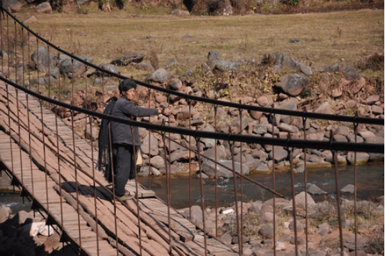 我們也走過這座橋梁,到村子里去。因為地處高原,呼嘯的大風吹的橋左右搖晃。可想而知,在沒有橋的情況下,汛期的拉青河就像一只窮兇極惡的野獸注視著村民,威脅著村民的安全。