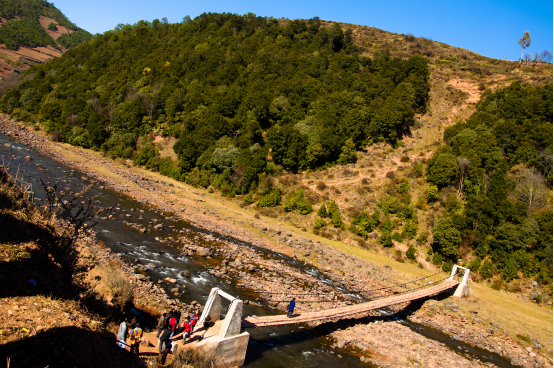 很快,車隊就進入了山區。作為一個從小就生活在城市里的人,看到路邊的彝族兒童,以及隨處可見的危橋,竟然使我產生了一種時空交錯的感覺。