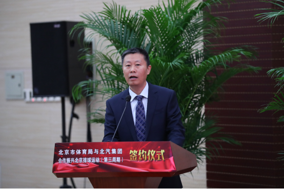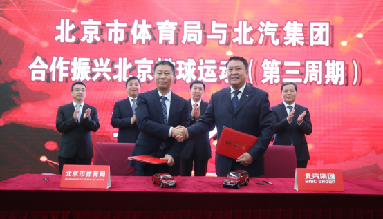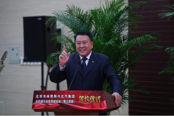 北汽集團黨委書記、董事長徐和誼(右)與北京市體育局局長趙文(左)在現場簽約