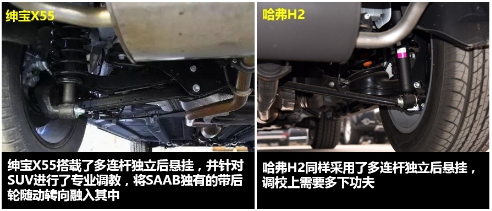 同樣是前麥弗遜+后多連桿獨立懸掛系統,紳寶X55對此處進行了精心調校,除吸收SAAB技術基因外,還與世界知名廠商米拉公司開展了合作。作為路虎、大眾廠商的御用伙伴,米拉讓這套系統在紳寶X55身上找到了舒適性、平穩性新的平衡比例,為消費者帶來了趣動的駕乘感受。同時,為了適應中國多彎道的實際,紳寶X55還成功將SAAB的后輪隨動轉向功能集成到后懸掛系統,由此帶來更好的靈活性。而反觀哈弗H2,在前后獨立懸掛的配置下換來的卻是論壇車主“調校過硬,顛簸感強”的抱怨聲。