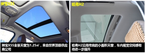 SUV車型似乎與自然、自由的汽車生活有著天然關聯。為此,紳寶X55在汽車的另一方“天空”天窗上似乎有意要拉開與哈弗H2的距離。哈弗H2沿用的是傳統天窗,配合電動開啟,給駕乘者提供仰望星空的輕松,這本無可厚非。紳寶X55卻沒有止步于此,它配備了1.25㎡ 的全景天窗,且是來自世界頂級供廠商英納法的大手筆,4.8mm隱私鋼化玻璃,既保證了安全,又實現良好的隔熱性,這與它手機互聯等時尚功能搭配,帶給消費者的輕松自由似乎并不是哈弗H2那般局限。