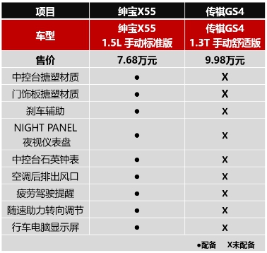 傳祺GS4 9.98萬-14.68萬元的售價在中國品牌中不算低,要比同樣定位于A級SUV車型的紳寶X55售價7.68萬-11.98萬元,足足高出一大截。低價低配或者低價低品自然不是編者所認(rèn)同的,但如果在惠民價格基礎(chǔ)上,讓消費(fèi)者利益最大化那自然值得推崇。對比來看,剎車輔助、隨速助力轉(zhuǎn)向調(diào)節(jié)、后排出風(fēng)口、Night Panel夜市儀表盤等一系列基本輔助配置,在北汽紳寶X55上屬于標(biāo)配,但傳祺GS4的基礎(chǔ)款上都未見到。這些看似很小的裝備,實(shí)際上對于駕車有著重要作用,以Night Panel夜市儀表盤來看,當(dāng)你加班至深夜駕車回家時,開啟這個功能即可減少車內(nèi)光線對于駕駛視線不必要的干擾,減少視覺疲勞,提升行車安全。
