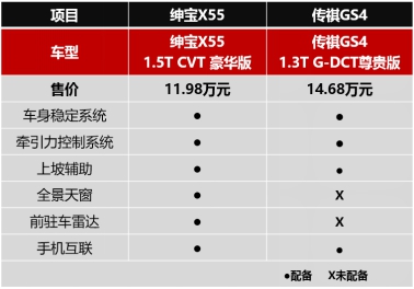 進(jìn)入到“市場反哺”新階段的紳寶X55,順應(yīng)市場需求,配置的豐富程度簡直就像開了掛。或許也正是因?yàn)檫@點(diǎn),在紳寶X55上市后,傳祺GS4的消費(fèi)者紛紛吐槽“虧大發(fā)了”。如何個虧法?我們來細(xì)細(xì)比較。
