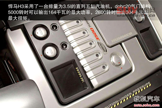 悍馬采用了一臺排量為3.5L的直列五缸汽油機,5000轉時可以輸出164千瓦的最大功率,2800轉時輸出304牛米的最大扭矩。雙頂置凸輪軸以及可變氣門正時,在兼具性能的同時提供良好的燃油經濟性。