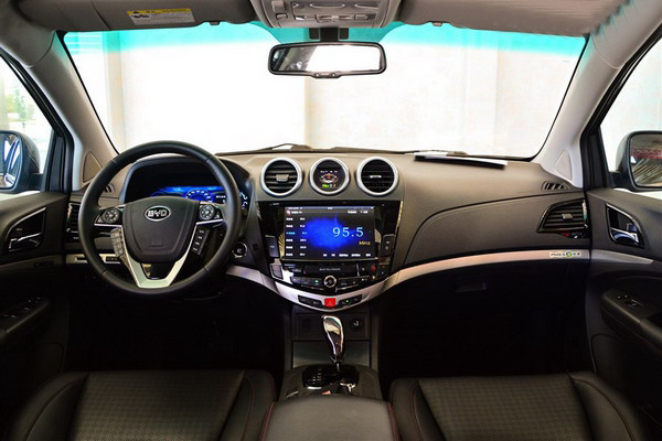 置身車內,比亞迪S7科技感極強,黑色鋼琴漆證明該車同樣注重豪華氛圍。該車方向盤采用三幅式多功能方向盤,該方向盤集成了娛樂系統等快捷鍵。中控臺方面,中控臺頂部出風口中間的小液晶屏顯示的是氣溫、海拔、指北針、以及PM濃度。中央的10.2英寸大屏是其內飾中亮點之一,值得一提的是BuildYourDream云服務系統,該系統可以用手機來同步獲取車輛信息以及為車輛發送導航信息等功能。配置方面,比亞迪S7應有盡有,裝配了胎壓監測、無鑰匙啟動/進入、ESP車身穩定控制、電動方向盤調節、座椅加熱/記憶等。另外,該車擁有PM2.5濾凈系統,該系統擁有超高凈化能力,可在4分鐘之內將PM2.5值由每立方米500微克降低至50微克以下。