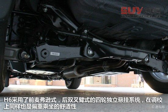 哈弗H6一改之前哈弗系列車型的非承載式車身,采用了城市SUV慣用的承載式車身。同時(shí),哈弗H6的獨(dú)立懸掛也能更好的吸收路面的顛簸,方向盤及變速箱等位置的反饋力度也更輕,總體感覺更加柔和,基本符合城市SUV強(qiáng)調(diào)舒適性的特點(diǎn)。哈弗H6四驅(qū)版車型采用博格華納的TOD四驅(qū)系統(tǒng),通過收集車輛信息判斷是否打滑或轉(zhuǎn)向,通過分動(dòng)器傳遞出大小可控的扭矩,從而實(shí)現(xiàn)兩驅(qū)與四驅(qū)模式的合理轉(zhuǎn)化,保證0-100%扭矩連續(xù)可變傳遞。
