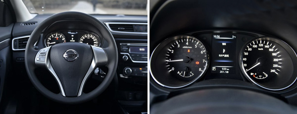 內(nèi)飾方面,逍客的內(nèi)飾風(fēng)格采用了名為飛翼式的環(huán)抱一體化布局,整體風(fēng)格與外觀相呼應(yīng),偏向年輕運動,很好的迎合了年輕人的審美。方向盤,采用了三輻式設(shè)計,方向盤多功能按鍵采用的是鍍鉻裝飾條,這樣給人感覺一種高端的運動感。儀表盤方面同樣采用的是是雙圓形類似炮筒式設(shè)計理念,不過中間的小屏幕顯示的信息非常豐富,行車電腦里還有對車道偏離提醒、盲區(qū)檢測、緊急制動以及駐車輔助等功能。