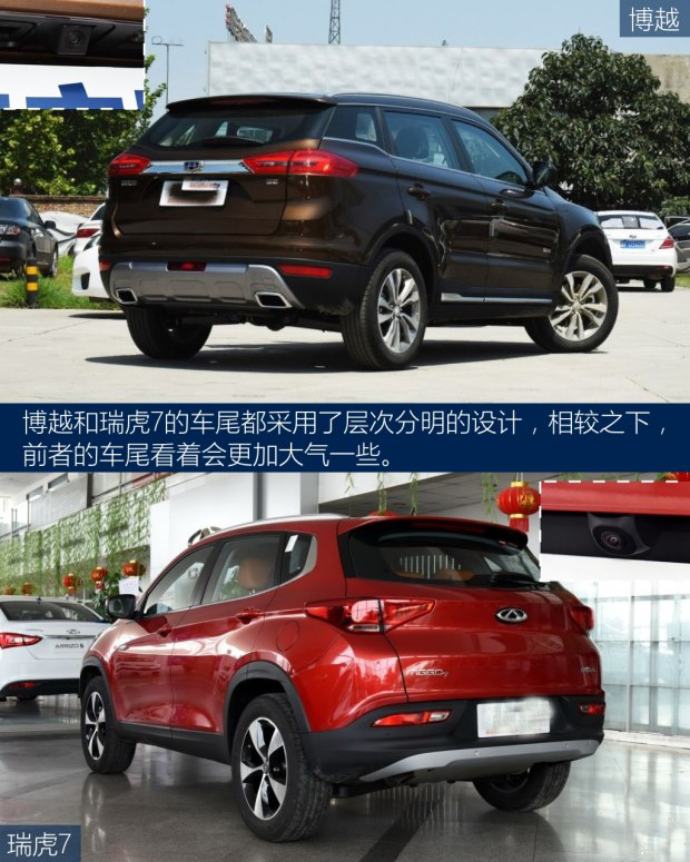 車尾方面,這兩款車都采用了層次感很強的設計方案,不過博越在線條的使用上更偏剛硬,而瑞虎7則顯得圓潤飽滿一些。至于尾燈,它們都采用了和各自的前燈組相呼應的造型設計,不過博越的尾燈更為扁平,向車身兩側延展的設計能讓車尾顯得更寬大,視覺效果更好一些。