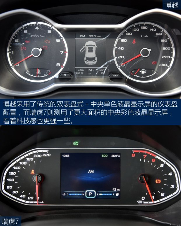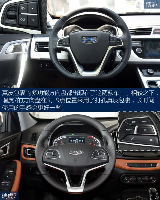 這兩款車的儀表盤和方向盤在功能配置上大體相當,儀表盤中間都帶有一塊液晶顯示屏,能夠顯示剩余油量、車輛狀態以及行車設定等信息。方向盤也都帶有定速巡航和音響系統控制按鍵,也都采用了真皮來進行包裹,配置上將不分伯仲。不過,瑞虎7的真皮方向盤在雙手經常握持的地方采用的是打孔真皮,觸感更好一些。而且它的儀表盤彩色中央液晶顯示屏也比博越的單色液晶屏尺寸更大,顯示效果更好。