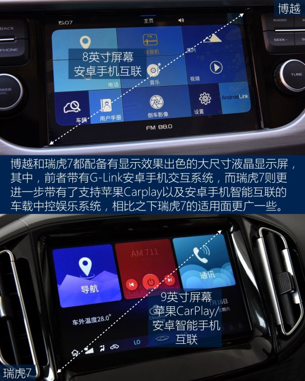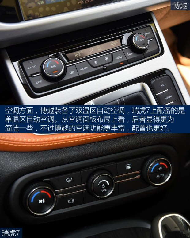 而在中控娛樂系統方面,博越的配置也較瑞虎7低一些,這次對比中的博越1.8TD 自動智尚型配備的是8英寸觸控屏幕,帶有吉利G-Link安卓手機智能互聯功能。而瑞虎7則配備了9英寸觸控屏幕,并且帶有蘋果CarPlay和安卓手機智能互聯的配置,在易用性上超越了這個版本的博越。但在空調配置上,博越的雙溫區自動空調又為它扳回一城。