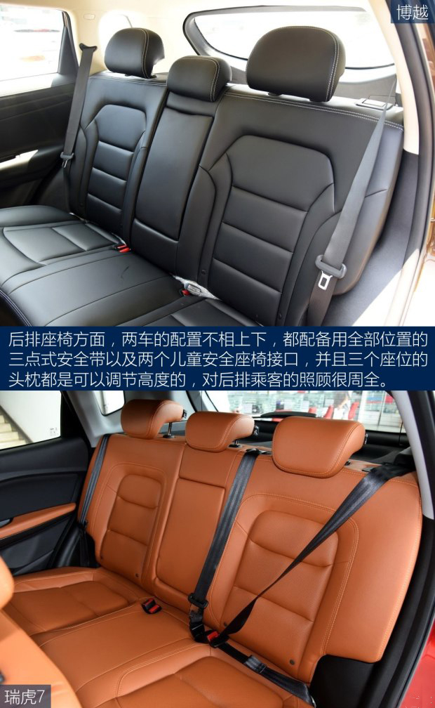 座椅材質方面,博越和瑞虎7都采用了皮革材質面料。相比之下,博越的座椅觸感更好,而且乘坐舒適性也好一些,實際的乘坐感受相當棒,有類似皮質沙發的乘坐體驗。但是瑞虎7帶有主駕駛席六向電動調節并支持腰部支撐調節功能,配置方面比前者更高。至于在寒冬季節相當實用的座椅電加熱功能,同樣只有瑞虎7有所提供,能為前排乘客帶來更舒適的駕乘感受。后排方面,都帶有全部位置的三點式安全帶,左右兩個兒童安全座椅接口,并帶有中央扶手,兩款車的后排配置大體相當。