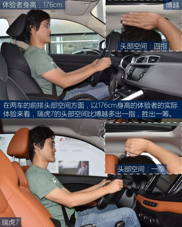 176cm的體驗者來到車內,將座椅高度調至最低,并處于合適的駕駛姿勢之后,博越的前排有四指的頭部空間,瑞虎7則有一拳余量。雖然瑞虎7的頭部空間優于博越,但兩車頭部空間的差距僅為一指,差距并不是很大。