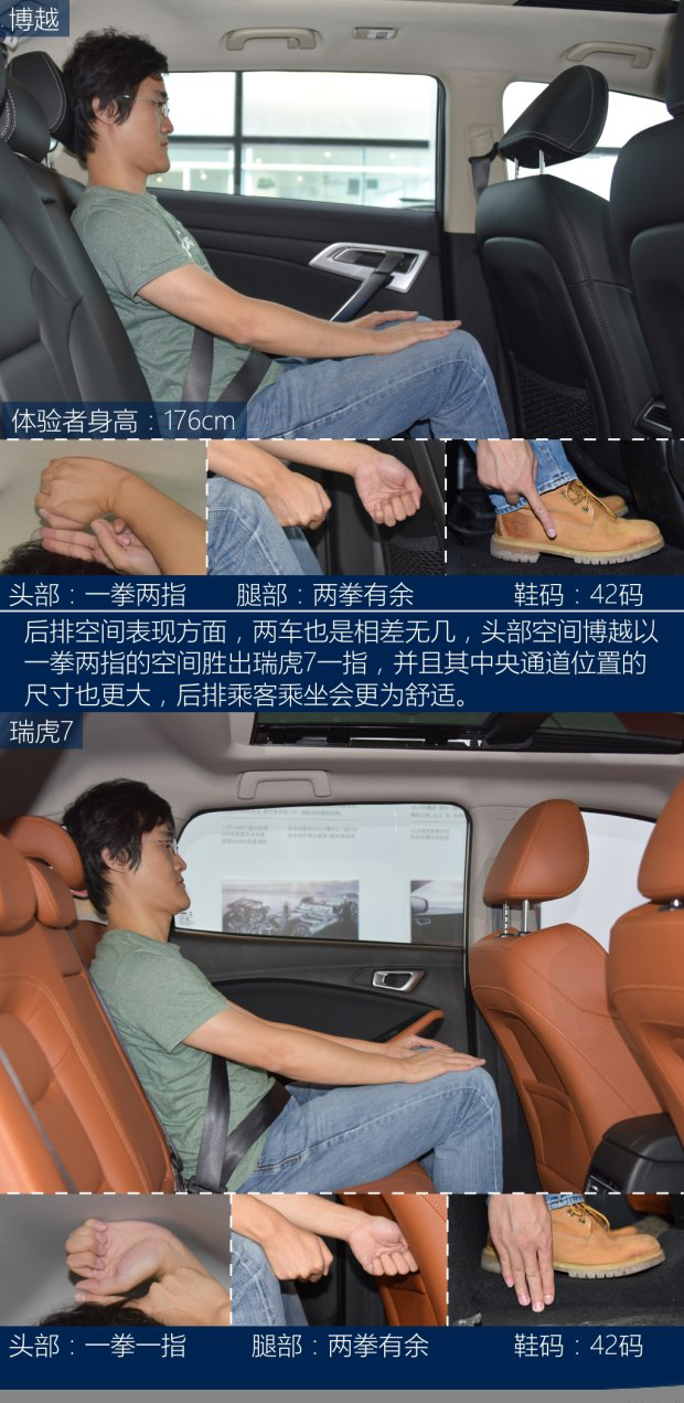 保持前排座椅位置不變,來到后排之后博越后排還剩余一拳兩指的頭部空間和兩拳多的腿部空間。瑞虎7的后排同樣擁有兩拳多的腿部空間,頭部空間表現略遜于前者,為一拳一指。在后排中央通道的高度方面,兩車的突起都不高。