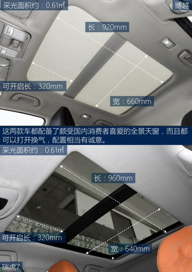 對不少消費者朋友來說,天窗是能夠提升用車幸福感的配置,而博越和瑞虎7配備了面積頗大的全景天窗,采光通風效果都很棒,對車輛的檔次感和舒適性提升能起到明顯作用。
