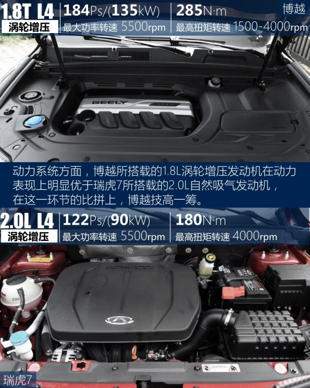動力方面,博越配備的是1.8T渦輪發動機+6速手自一體變速箱的動力組合,而瑞虎7則配備了2.0L自然吸氣發動機+CVT無極變速箱的動力組合。相比之下,博越所搭載的1.8T發動機動力更加充裕。