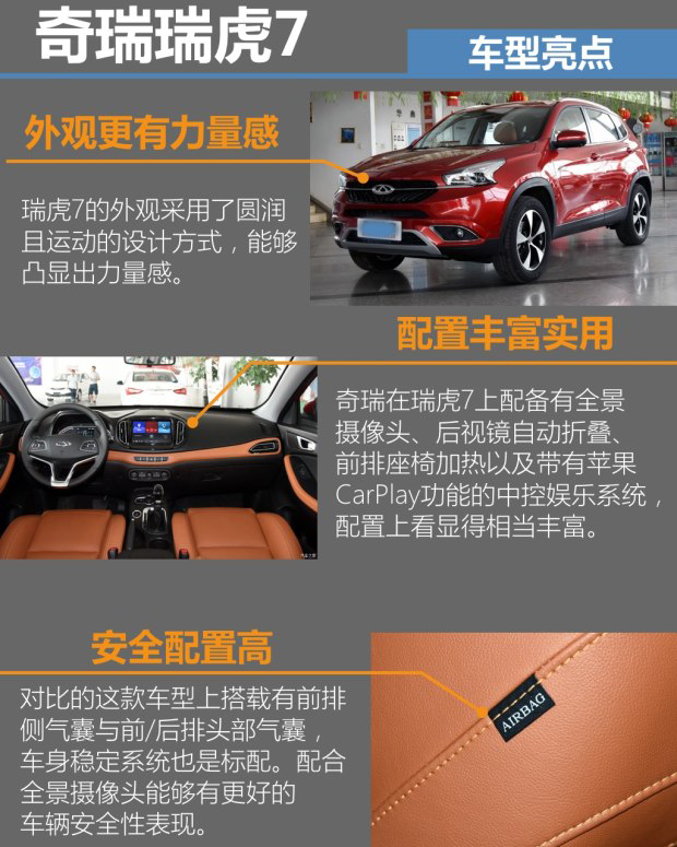 在配置上,瑞虎7比博越多了轉向輔助燈、防紫外線/隔熱玻璃、感應雨刷,前排座椅加熱、主駕駛席電動調節等一系列功能,中控屏幕也比后者大,而且還支持蘋果CarPlay,功能更實用。安全配置方面,兩車均配有車身穩定控制系統和上坡輔助功能,雖然博越比瑞虎7多了自動駐車和陡坡緩降,但是后者憑借全景影像、前后排頭部氣囊等配置又扳回一城。因此總體來看,瑞虎7的配置更高一些。