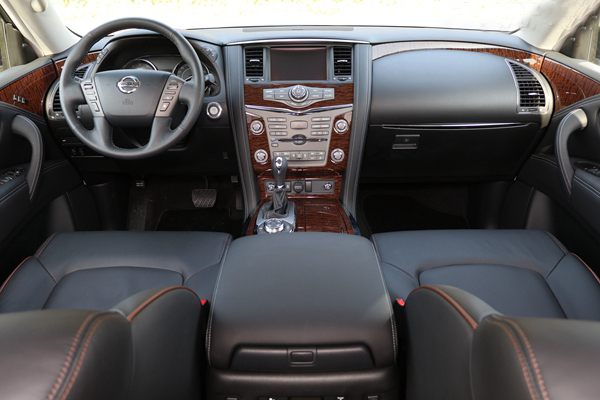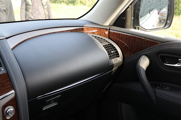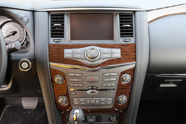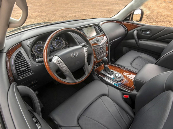 內(nèi)飾與老款QX56其實沒有太大區(qū)別,大量皮質(zhì)包裹與實木材質(zhì)的搭配顯得比較豪華,四幅桃木方向盤的手感細膩,依然是老式豪華車慣用的設(shè)計手法。方向盤的功能也是相當(dāng)完備,音響控制、藍牙電話、定速巡航和DCA車距控制輔助系統(tǒng)都可以通過快捷鍵來操作完成。