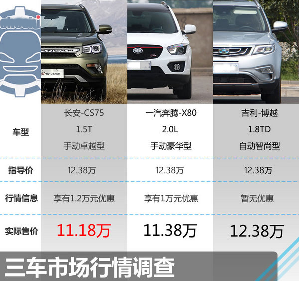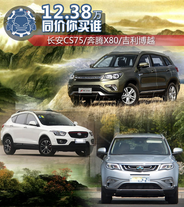 本次對(duì)比的三款緊湊級(jí)SUV分別是長(zhǎng)安CS75 2016款 1.5T手動(dòng)卓越型、奔騰X80 2017款 2.0L手動(dòng)豪華型和吉利博越 2016款 1.8TD 自動(dòng)智尚型,三款SUV車(chē)型均在汽車(chē)市場(chǎng)受到了較大的關(guān)注度,且裸車(chē)售價(jià)都為12.38萬(wàn)元,那么究竟三款車(chē)型誰(shuí)更具性價(jià)比還要看看以下的比拼。
