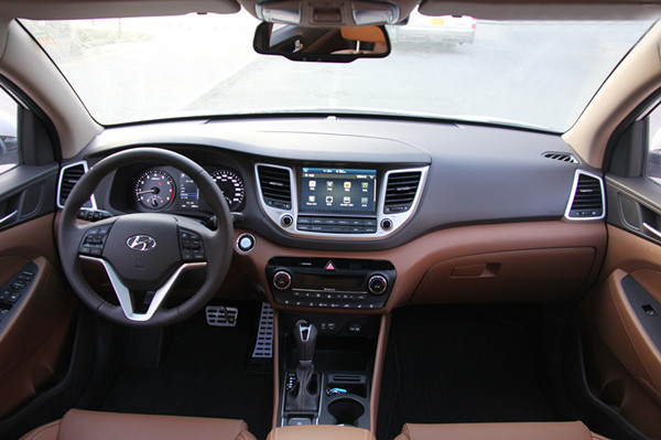 內(nèi)飾進行了深色的配色,空調(diào)、方向盤、檔位都有銀色飾條,新車的功能布局采用現(xiàn)代最新的家族式布局,與ix25有些類似,中控臺中央裝配了多媒體顯示屏,空調(diào)出風(fēng)口位于兩側(cè),向下依次為空調(diào)控制區(qū)以及點煙器等。