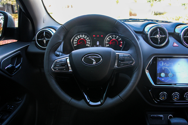 方向盤采用了三幅式多功能方向盤設計,支持上下兩向調節。此外,高配車型都使用了真皮對其進行包裹,但打孔處的手感并不太細膩。
