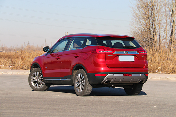 博越車尾的造型頗有幾分美系SUV的風格,提高的“臀線”、車頂的擾流板、雙邊共雙出的排氣布局都體現出較強的運動感。新車后保險杠采用了雙色設計,銀色的護板不僅讓車尾顯得更加時尚,也增添了幾分野性美。