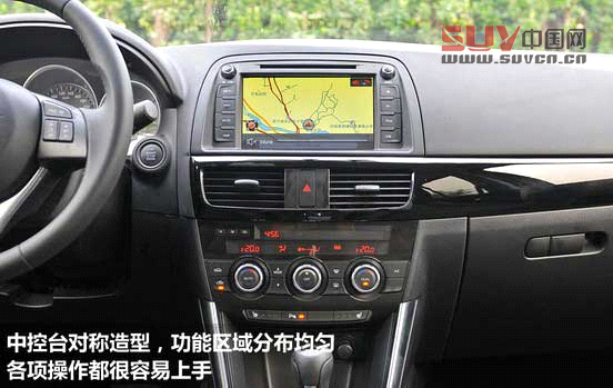 CX-5采用了全黑內(nèi)飾以襯托其運動的特性,中控臺采用大面積的軟性塑料包裹,做工和鑲嵌工節(jié)保持了進口馬自達(dá)一貫的水平。它的布局簡潔明了,各項功能布局清晰。TCS牽引力控制、DSC車身穩(wěn)定控制屬于全系標(biāo)準(zhǔn)配置,但引入國內(nèi)的馬自達(dá)CX-5頂配車型與海外版本相比仍然存在配置上的差距,胎壓監(jiān)測、變道輔助系統(tǒng)、偏航提示等配置并沒有引入國內(nèi)。
