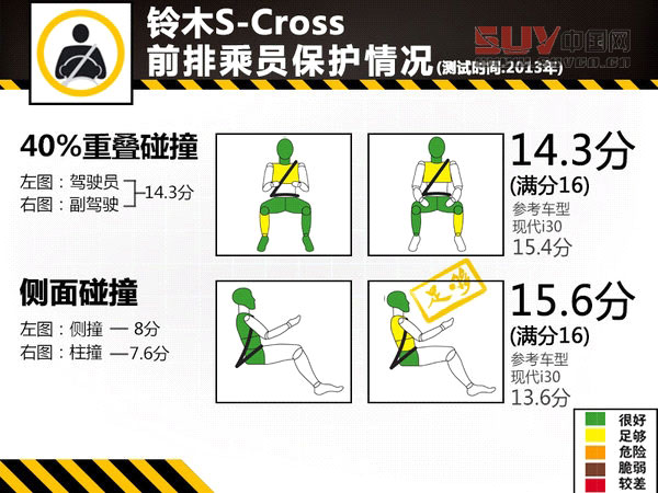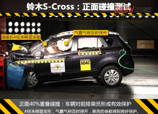 在正面的碰撞測(cè)試中,鈴木S-Cross碰撞后A柱和車(chē)門(mén)并未明顯變形,駕駛艙保持完整,安全氣囊和側(cè)氣簾及時(shí)彈開(kāi),車(chē)輛對(duì)前排乘員全身所有部位均提供了良好的保護(hù)。該項(xiàng)測(cè)試中S-Cross的成績(jī)?yōu)?4.3分,此項(xiàng)測(cè)試滿(mǎn)分為16分,現(xiàn)代i30此項(xiàng)成績(jī)?yōu)?5.3分。