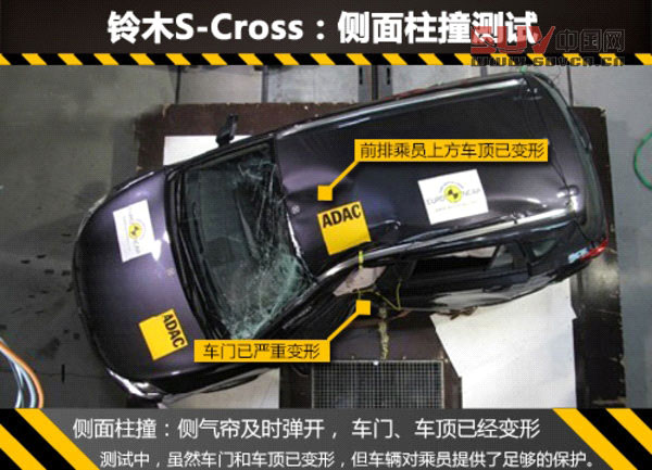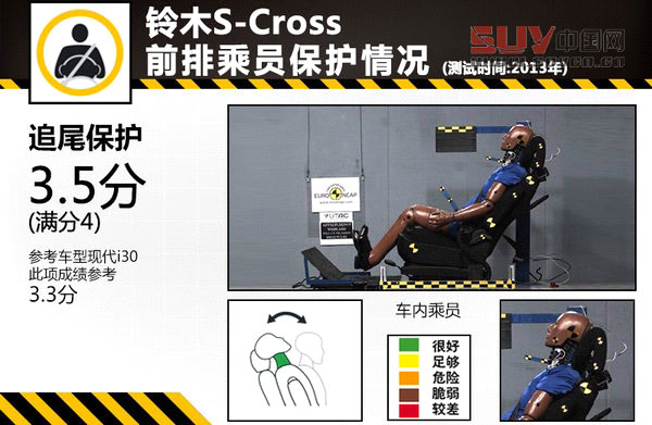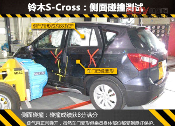 側(cè)面碰撞測(cè)試被分為側(cè)撞和柱撞兩種不同的測(cè)試方式,鈴木S-Cross在側(cè)撞時(shí)側(cè)氣簾及時(shí)彈開(kāi),雖然車(chē)門(mén)經(jīng)撞擊后已變形,但車(chē)內(nèi)乘員身體的所有部位都受到良好的保護(hù),新車(chē)側(cè)撞取得滿(mǎn)分8分的良好成績(jī),現(xiàn)代i30則為7.7分。在更為嚴(yán)苛的柱撞測(cè)試中,雖然在經(jīng)過(guò)撞擊后前排乘員上方車(chē)頂已經(jīng)明顯變形并且車(chē)門(mén)已嚴(yán)重變形,但側(cè)氣簾對(duì)乘員頭部的保護(hù)還是充分的,車(chē)輛對(duì)乘員身體的其他部位也提供了足夠的保護(hù)。柱撞滿(mǎn)分為8分,S-Cross和i30的成績(jī)分別為7.6分和5.9分。在追尾保護(hù)方面,鈴木S-Cross的座椅和頭枕可以在追尾碰撞事故時(shí)為乘員提供良好的保護(hù),避免頸椎過(guò)度屈伸的損傷 。
