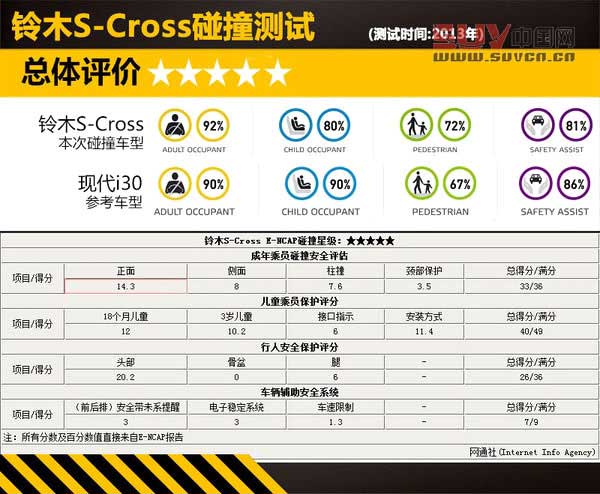 鈴木S-Cross的最終評(píng)定碰撞星級(jí)為最高的5星,從總成績(jī)來(lái)看,新車(chē)與同樣達(dá)到5星標(biāo)準(zhǔn)的現(xiàn)代i30不分軒輊。在乘員安全、行人安全和車(chē)輛輔助安全三項(xiàng)上S-Cross得分略高于i30,在兒童安全測(cè)試上i30則比S-Cross略勝一籌。值得關(guān)注的是在行人安全測(cè)試中,鈴木S-Cross的行人骨盆保護(hù)項(xiàng)測(cè)試成績(jī)?yōu)?分,新車(chē)對(duì)行人安全的保護(hù)還有待提升。