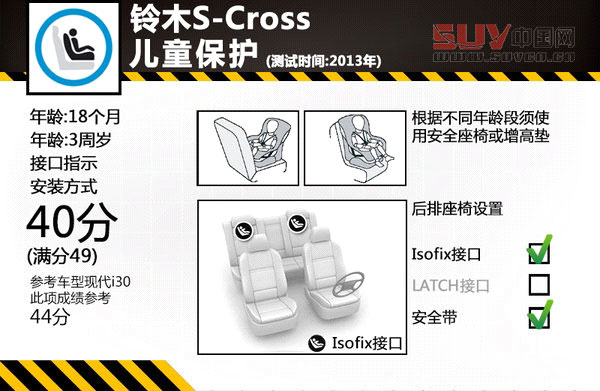 兒童安全保護(hù)也是評(píng)定一款車(chē)型的安全標(biāo)準(zhǔn)之一,在正面碰撞和側(cè)面碰撞中,兒童座椅中的模擬假人都受到良好的保護(hù)。在兒童座椅安全接口提示和安裝方式方面,鈴木S-Cross在后排座椅提供了兩個(gè)ISOFIX接口,所處位置操作均較為方便,而在安裝指示的各種標(biāo)識(shí)也非常清晰。值得稱(chēng)贊的是:S-Cross副駕駛安全氣囊可以關(guān)閉,用以安裝背向式兒童安全座椅,并且在車(chē)內(nèi)有清晰的信息提示。此項(xiàng)測(cè)試成績(jī)滿(mǎn)分為49分,S-Cross和現(xiàn)代i30的成績(jī)分別是40分和44分。