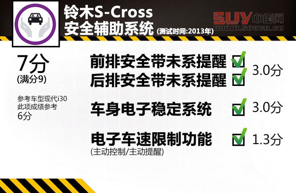 在車(chē)輛的輔助安全技術(shù)評(píng)估環(huán)節(jié)中,車(chē)速限制、ESP車(chē)身穩(wěn)定系統(tǒng)以及安全帶未系提示都是其評(píng)估項(xiàng)目,每項(xiàng)裝配技術(shù)都將決定最終分值的高低。鈴木S-Cross的上述4項(xiàng)安全輔助系統(tǒng)都是標(biāo)準(zhǔn)配置。此項(xiàng)測(cè)試滿(mǎn)分為9分,S-Cross的成績(jī)?yōu)?分,比現(xiàn)代i30的成績(jī)高出1分。