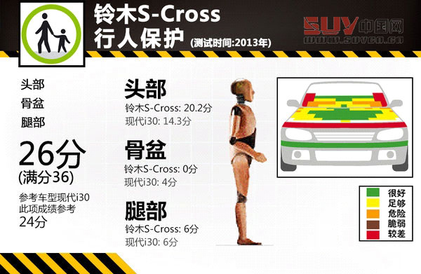 在行人保護(hù)測(cè)試中鈴木S-Cross對(duì)行人頭部的保護(hù)比較到位,對(duì)行人腿部的保護(hù)方面與現(xiàn)代i30一同獲得了6分滿(mǎn)分。但在行人骨盆保護(hù)測(cè)試上該車(chē)的成績(jī)卻為0分,發(fā)動(dòng)機(jī)罩前部邊緣區(qū)域以及A柱末端,在碰撞中都可能會(huì)對(duì)行人造成一定的傷害風(fēng)險(xiǎn),S-Cross的對(duì)行人的保護(hù)還需進(jìn)一步提升。